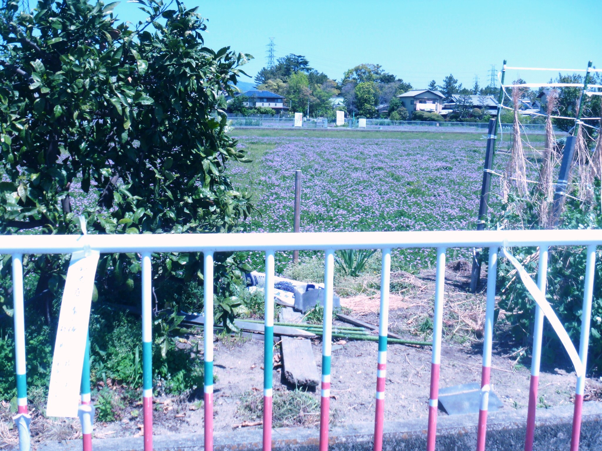 明日(4月28日)は三島江のレンゲ祭りです。私は夏の小学生合宿の下見で行くことができないので、今日現地に行ってきました。幼稚園と保育所の子供たちがレンゲで遊んで帰るところでした。他には農家の日と数人とあいさつを交わした程度です。明日もよい天気のようで、きっと大勢の人でにぎわうことと思います。